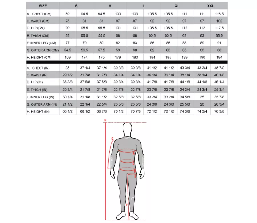 (cm)79-83 83-87 87-91 91–95 95–99 99-103 103–107 107-111 111–115 115–119 119–123 123–127 127-131 D. Stehno (cm) 48–49 50 - 51 52 - 53 54–55 56-57 58–59 60-61 62-63 64–65 66-67 68-69 70-71 72-73 E. Vnitřní šev (cm) 71-72 73-74 75-76 77-78 79-80 81-82 83-84 85-86 87-88 89-90 89-90 91-92 91-92 F. Vnější rameno (cm) 49–50 51-52 53–54 55–56 57-58 59 - 60 61-62 63-64 65-66 67-68 67-68 69-70 69-70 G. Výška (cm) 150–156 157-163 164–167 168-171 172–175 176–179 180–183 184–187 188–191 192–195 192–195 196–199 196–199 Pánské velikosti bot ALPINESTARS