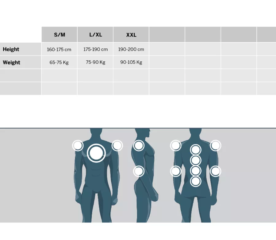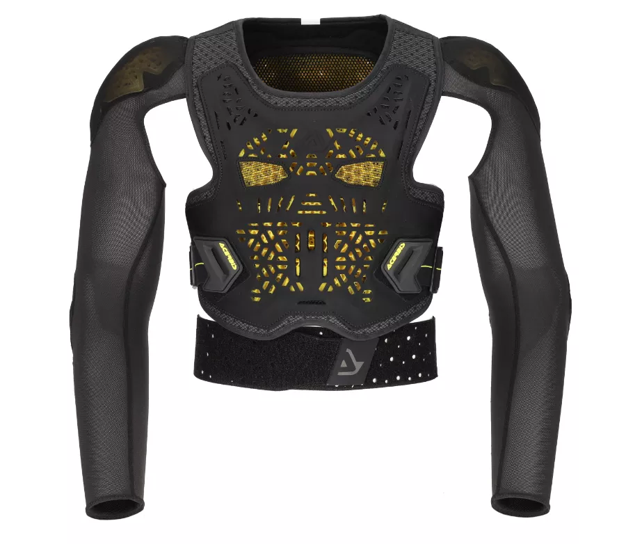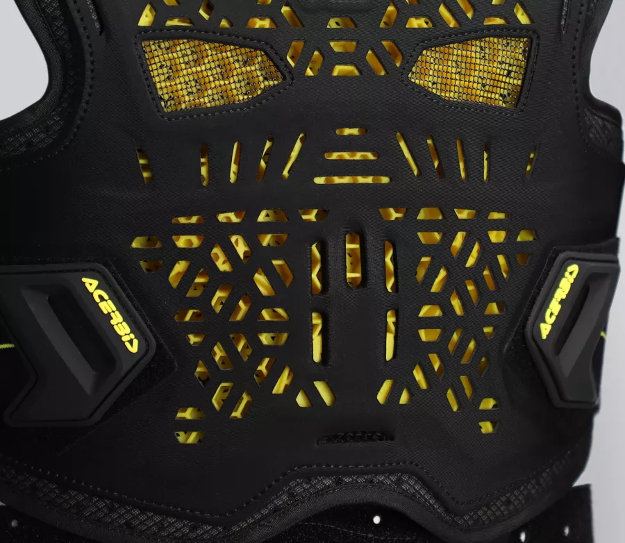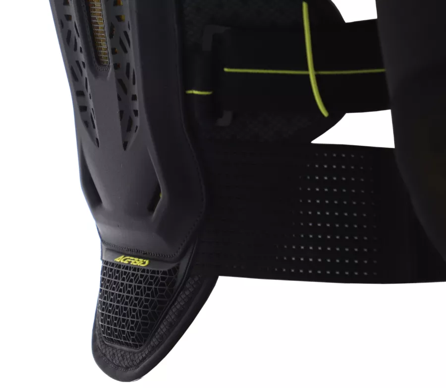 Chrániče hrudi, zad, ramen a loktů splňují CE certifikaci úrovně 2, takže poskytují vysokou míru bezpečí i při náročném použití. Polstrované ramenní popruhy zvyšují stabilitu při jízdě, elastické boční nastavení a bederní pás umožňují přesné přizpůsobení postavy. Systém je plně kompatibilní s krčními chrániči a podpěrami krční páteře.