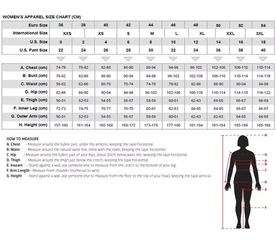 Velikost 120 130 140 150 Mezinárodní velikost S M L XL Velikost USA 22 24 26 28 A. Hrudník (cm) 60,5 - 65,5 65,5 - 70,5 70,5 - 75,5 75,5 - 80,5 B. Pas (cm) 54–58 58-62 62-66 66-70 C. Boky (cm) 68-72 72-76 75-80 80–84 D. Stehno (cm) 40 - 42 42 - 44 44 - 46 46-48 E. Vnitřní šev (cm) 51,1 - 56,5 56,5 - 61,5 61,5 - 66,5 66,5 - 71,5 F. Vnější rameno (cm) 40–44 44–48 48-52 52 - 56 G. Výška (cm) 120–130 130–140 140–150 150–160