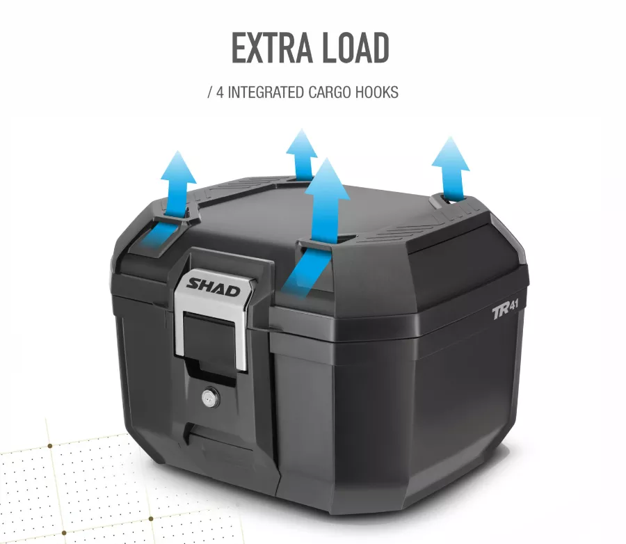 Topcase SHAD TERRA TR41 je univerzální kufr navržený pro každodenní jízdu i dobrodružství mimo asfalt. Nabízí dostatek prostoru pro dvě otevřené přilby typu JET nebo náklad až 5 kg, přičemž si zachovává nízkou hmotnost a vysokou odolnost. Konstrukce z vyztuženého polypropylenu byla 100% navržena v Barceloně a zvládne i náročné podmínky na silnici i v terénu.