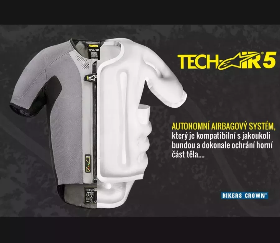 Airbagový systém Tech-Air® 5 poskytuje jedinečnou ochranu horní části těla, poskytuje specifické pokrytí ramen, hrudníku, žeber a celých zad. Efektivně a účinně u jezdce minimalizuje rizika zranění ramene a klíční kosti. Alpinestars Tech-Air® 5 v současné době poskytuje nejkomplexnější ochranu ze všech momentálně dostupných airbagů na světovém trhu. Bikers Crown - oficiální dovozce Alpinestars