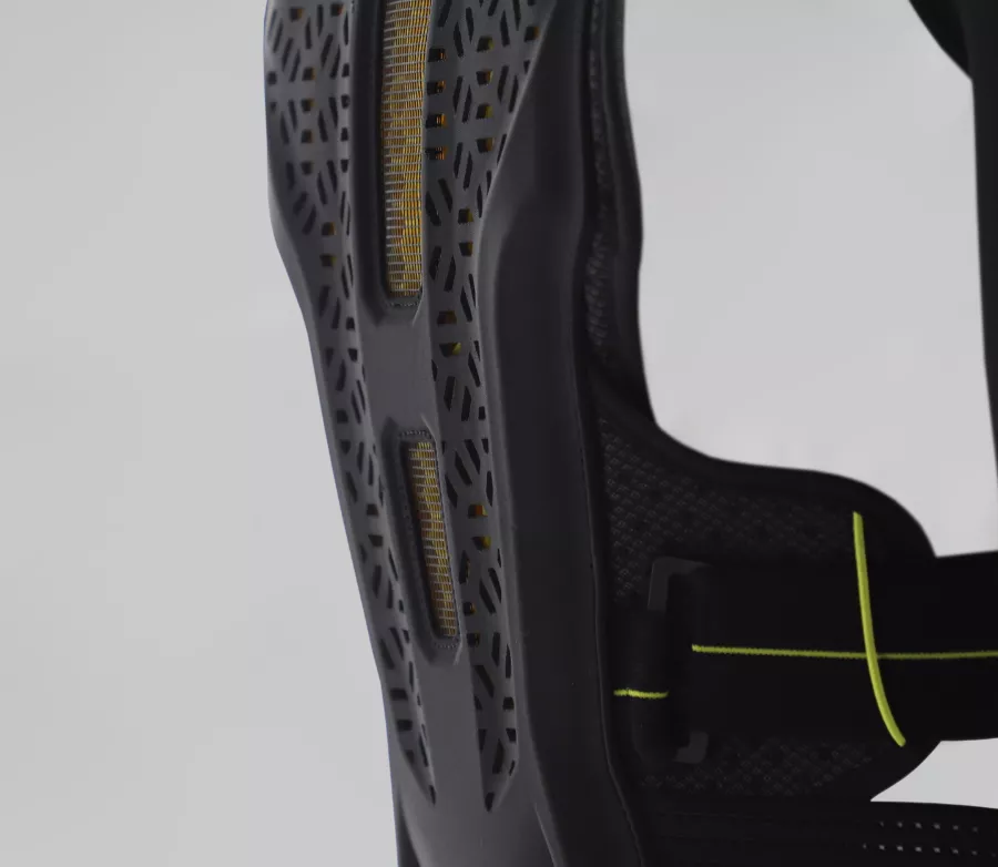 Vícevrstvé řešení kombinuje vysoce účinné viskoelastické materiály pohlcující nárazy s polotuhou biofoam vnější částí. Výsledkem je vysoká odolnost, stabilita a dlouhá životnost při zachování volnosti pohybu. Střih je optimalizovaný pro moderní vzhled, funkčnost a maximální komfort bez omezení při jízdě.