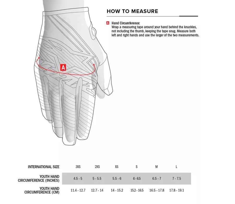 Velikost 120 130 140 150 Mezinárodní velikost S M L XL Velikost USA 22 24 26 28 A. Hrudník (cm) 60,5 - 65,5 65,5 - 70,5 70,5 - 75,5 75,5 - 80,5 B. Pas (cm) 54–58 58-62 62-66 66-70 C. Boky (cm) 68-72 72-76 75-80 80–84 D. Stehno (cm) 40 - 42 42 - 44 44 - 46 46-48 E. Vnitřní šev (cm) 51,1 - 56,5 56,5 - 61,5 61,5 - 66,5 66,5 - 71,5 F. Vnější rameno (cm) 40–44 44–48 48-52 52 - 56 G. Výška (cm) 120–130 130–140 140–150 150–160 Rukavice ALPINESTARS