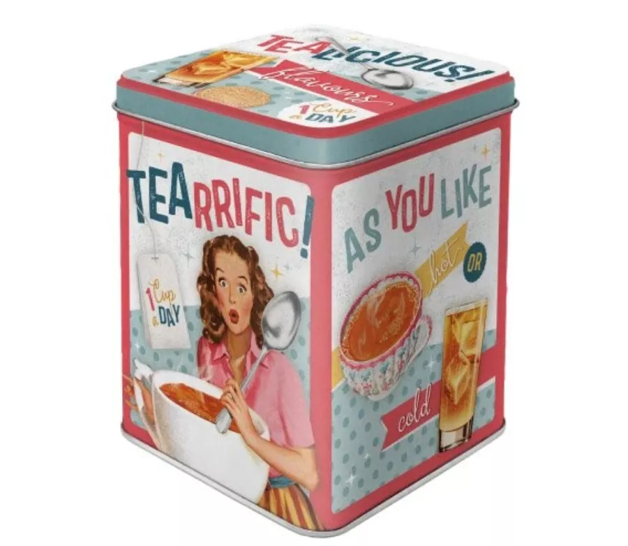 Retro plechová dóza na čaj s textem je originální dekorace. Tato plechová dóza "Tearrific!" je skvělým dárkem pro všechny, kteří mají rádi vtipné retro dekorace. Je vyrobena z kvalitního plechu. Pokud hledáte originální dekorace, pak je tato plechová dóza ideální volbou. Rozměr: 73 x 94 x 73 mm Materiál: plech
