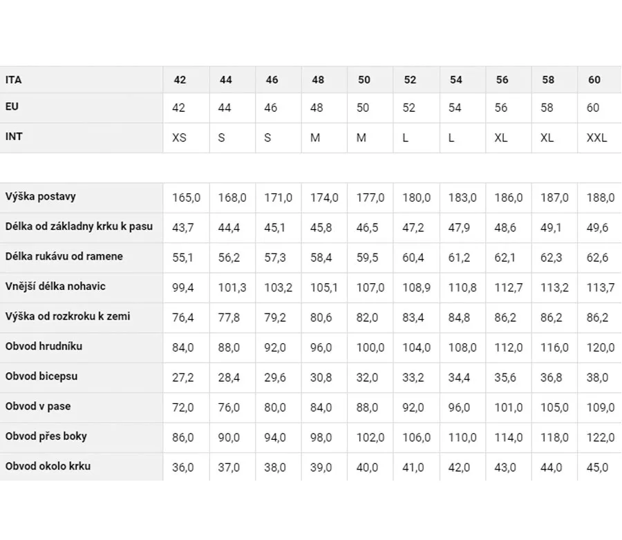 (cm)90 94 98 102 106 110 116 120 124 I. Vnitřní šev (cm) 77.8 79.2 80.6 82 83.4 84.8 86.2 86.2 86.2 O. Vnější šev (cm) 101.3 103.2 105.1 107 108.9 110.8 112.7 113.2 113.7 H. Výška (cm) 168 171 174 177 180 183 186 187 188 Pánské velikosti kalhot DAINESE