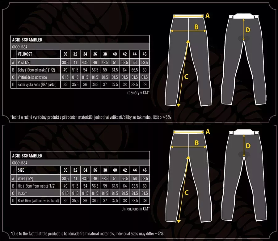 POPIS POŠKOZENÍ:Pod kolenem vzadu flek, vzadu dole na nohavici vybledlý pruh. Toto drobné poškození je jen kosmetického rázu a nemá absolutně žádný vliv na funkčnost a bezpečnost. Tyto džíny jsou nutností pro všechny vyznavače vintage stylu a zejména pro fanoušky scramblerů. Retro vzhled docílený pomocí pracího procesu vytváří autentické oblečení pro vintage jezdce. Nejenže vám tyto džíny zajistí perfektní vzhled, ale i absolutní pohodlí a podstatnou míru bezpečnosti. Tyto džíny ve střihu slim-straight vám bezpochyby skvěle padnou, protože jsou vyrobené z elastického denimu. Funkční a dobře vypadající strečové panely nad koleny, v rozkroku a zadní části pasu podporují celkový komfort. Oděruvzdorná podšívka z materiálu Kevlar®, vyrobená progresivní technologií DuPont ™ v oblastech kolen a zadní části stehen, vás v případě potřeby ochrání proti odření. Vyjímatelné chrániče, které splňují úroveň CE level 2 na kolenou a bocích, jsou dodávány jako standardní příslušenství. Poskytují účinnou ochranu při nárazu. Při výrobě džínů Acid Scrambler se používají pouze vysoce kvalitní komponenty. Kovové zipy YKK a originální materiál Kevlar® od společnosti DuPont ™. Když jezdíte v teplých letních dnech, nenápadné větrací kapsy na stehnech zajistí potřebný přísun čerstvého vzduchu vždy, když ho potřebujete. Vyvýšený pas zakryje spodní část vašich zad. Boční kapsy na suchý se hodí pro uložení nezbytností. MATERIÁL vnější materiál: elastický denim 11,5 oz, 98 % bavlna, 2 % elastan podšívka: aramidová vlákna v oblasti kolen a zadní strany stehen z materiálu Kevlar® vyrobeného progresivní technologií DuPont ™ BEZPEČNOST chrániče CE Level 2 na kolenou a bocích ERGONOMICKÉ VLASTNOSTI 4 standardní kapsy a dvě boční kapsy na suchý zip strečové panely nad koleny, v pase a rozkroku nastavitelná výška kolenních chráničů dvojitá poutka vpředu vyvýšený pas VENTILACE větrací kapsy na stehnech prodyšný panel v rozkroku