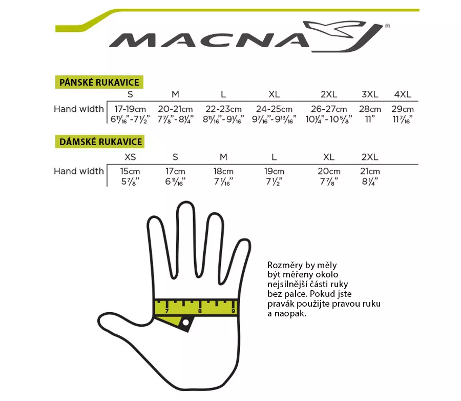 Pánské velikosti rukavic MACNAVelikost pánských rukavic XS / 7,5 S / 8 M / 8,5 L / 9 XL / 9,5 2XL / 10 3XL / 10,5 4XL / 11 A: Šířka (obvod v cm) 19-20 20-21 21-22 22-23 24-25 25-26 26-27 27-28 Délka 17,5 18 18,5 19 19,5 20 20,5 21 Dámské velikosti rukavic MACNA