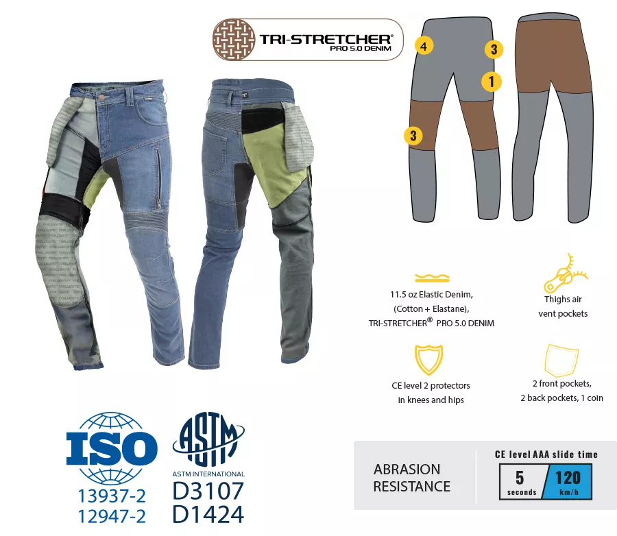Další člen rodiny Parado, který nyní neobsahuje kevlarovou vrstvu. Parado Doublelayer AAA džíny jsou podšity novým materiálem Tri-Stretcher® PRO 5.0 Denim na strategických místech – kolena, boky a zadek. Tento materiál sám v jedné vrstvě splňuje nejpřísnější certifikační požadavky třídy AAA. Tímto spojením vznikly džíny, které jsou na vrcholu bezpečnosti, co se týče otěruvzdornosti. - Svrchní materiál: elastický denim 11,5 oz, 98 % bavlna, 2 % elastan - Podšité Tri-Stretcher® PRO 5.0 Denim na strategických místech - CE level 2 chrániče kolen a boků součástí - Kolenní chrániče je možné posouvat do stran a na potřebnou výšku. - 2 přední, 2 zadní - zapínání na 2 knoflíky a zip - ventilační kapsy na stehnech - prodyšný streč v oblasti sedu - originální YKK kovové zipy na poklopci a na ventilačních kapsách - kovový knoflík s logem Trilobite v pase - vpředu dvojitá poutka na pásek - v bederní oblasti zvýšený pas pro maximální komfort při jízdě - zvýšená zadní část pasu pro komfort při jízdě - CE Certifikováno dle EN 17092-2:2020, třída AAA - dostupné v pánském a dámském střihu a v několika barvách Vlastnosti materiálu Tri-Stretcher® PRO 5.0 Denim Základní myšlenkou bylo vyvinout tkaninu, která bude vynikat pohodlím, bezpečností a zároveň splní náročné požadavky na střih, opotřebení, roztržení, otěruvzdornost a chemickou odolnost finálního výrobku při CE Certifikačních testech. Tri-Stretcher® PRO 5.0 Denim je speciální směsí Aramidu, Nylonu, Polyesteru, bavlny a Elastanu patentovaná společností Bikers Crown s.r.o., která je výhradním vlastníkem a materiálu a zároveň designérem motocyklových džínů Trilobite. Díky nedávným průlomům v oblasti syntetických vláken mohou být džíny pro jízdu na motocyklu lehčí než kdykoliv předtím. Nová generace syntetických a polyethylenových vláken umožňuje smíchat Polyester, Nylon, Elastan a další příze, například i přírodní, do zcela nové, sofistikované tkaniny pro výrobu motocyklových džínů Trilobite. Tri-Stretcher® PRO 5.0 Denim je moderní technická tkanina, která je budoucností jízdy na motocyklu. Vyrábí se ze směsi materiálů z rodiny polyamidů jako je Nylon a aromatických polyamidů, jako je Aramid nebo polyuretanová vlákna vyrobená z Elastanu, a zároveň zahrnuje přírodní bavlněnou tkaninu. Tato látka je jedinečná svou úžasnou pevností a zároveň nízkou hmotností. Tri-Stretcher® PRO 5.0 Denim je jeden „chytrý tým“ různých vláken spletených dohromady, které vás v případě nehody ochrání stejným způsobem jako celokožená kombinéza, ale bez kompromisu na pohodlí. Značka TRILOBITE® nabízí svým zákazníkům možnost využití tzv. TRILOBITE® Crash programu. Každý jezdec, který je účastníkem dopravní nehody a nosí motocyklové jeans TRILOBITE®, které během nehody poškodí, automaticky získá zcela nové produkty. Tento program funguje tak, že svou nehodu popíšete, zdokumentujete a pošlete informace na centrálu spolu s poškozenými kalhotami. Výrobce TRILOBITE® vše zanalyzuje a poznatky použije při vývoji dalších výrobků. V případě splnění podmínek vám zašle zcela nový kus.