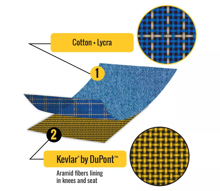 - vyrobeno z Denimu (bavla, lykra) - CE level 2 chrániče kolen součástí - kapsa pro vložení chráničů boků (nejsou součástí balení) - vyztužení z aramidových vláken v oblasti kolen a zadní části - 2 přední kapsy - 2 zadní kapsy - 1 kapsa na mince - nastavitelná výše kolenních chráničů - prodyšný panel mezi stehny - dvojitá poutka na opasek - CE Certifikovaný oděv dle EN 17092-3:2020 AA