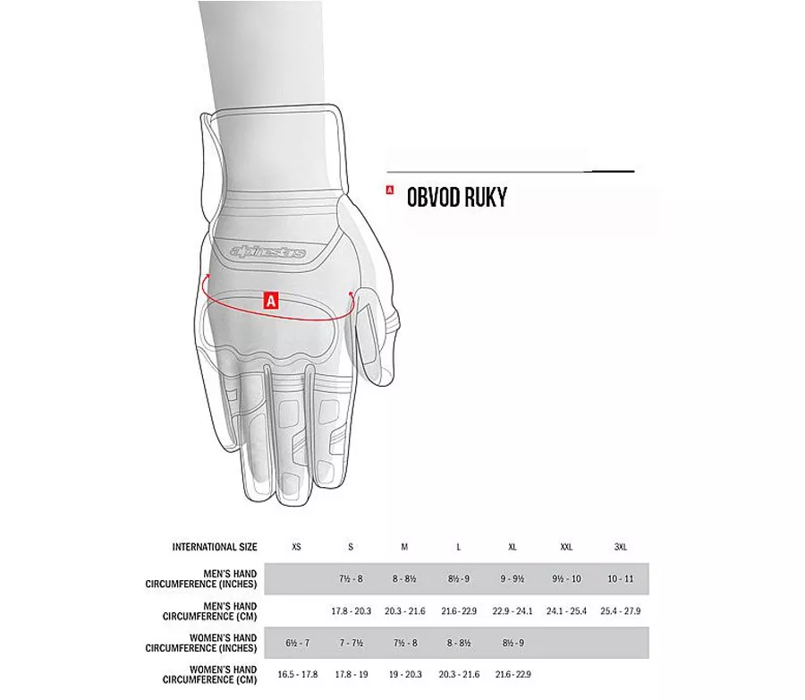 Rukavice ALPINESTARSVelikost (v cm) XS S M L XL Pánské 17,8-20,3 20,3-21,6 21,6-22,9 22,9-24,1 Dámské 16,5-17,8 17,8-19 19-20,3 20,3-21,6 21,6-22,9 Chrániče zad ALPINESTARS