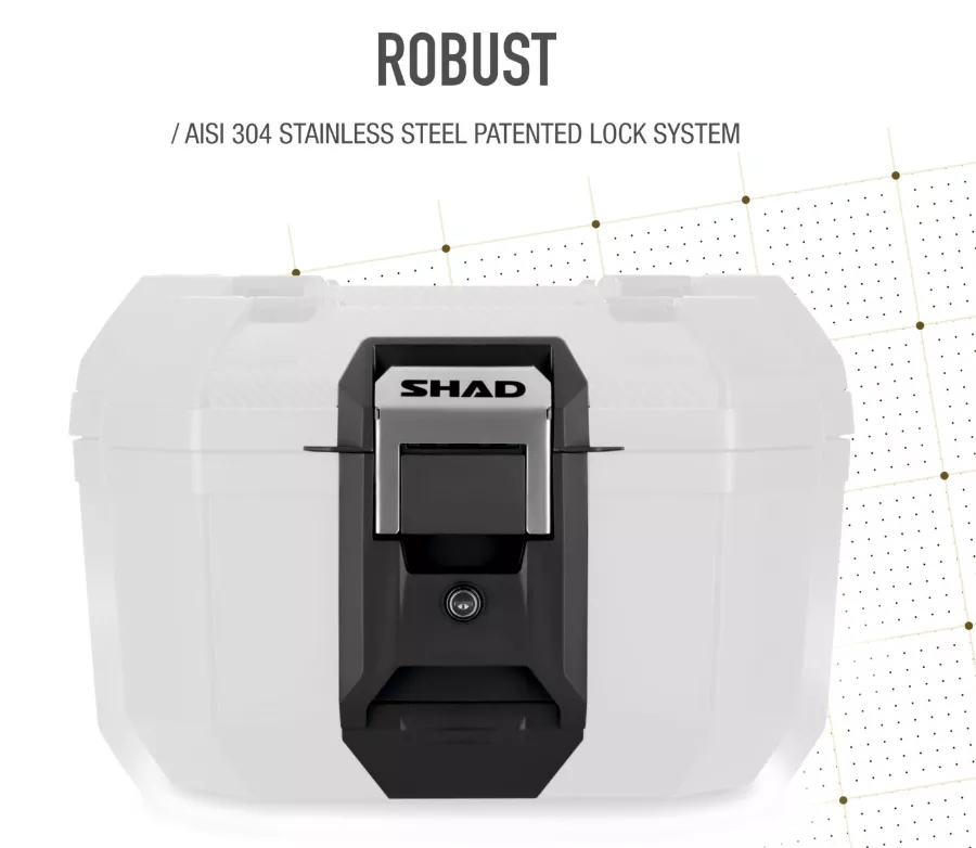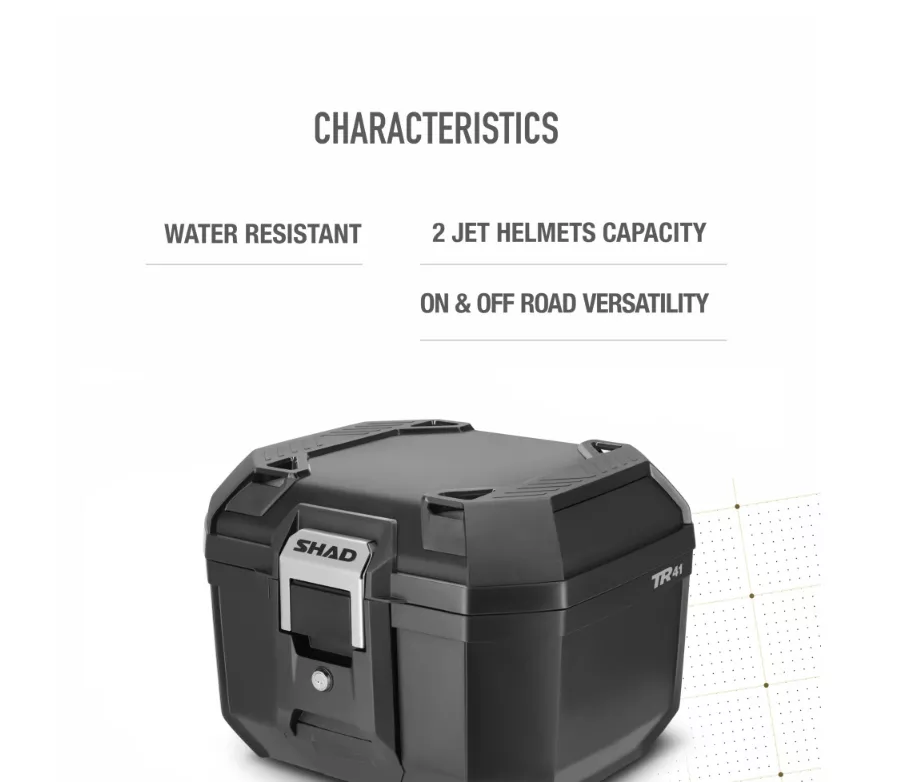 Topcase SHAD TERRA TR41 je univerzální kufr navržený pro každodenní jízdu i dobrodružství mimo asfalt. Nabízí dostatek prostoru pro dvě otevřené přilby typu JET nebo náklad až 5 kg, přičemž si zachovává nízkou hmotnost a vysokou odolnost. Konstrukce z vyztuženého polypropylenu byla 100% navržena v Barceloně a zvládne i náročné podmínky na silnici i v terénu.